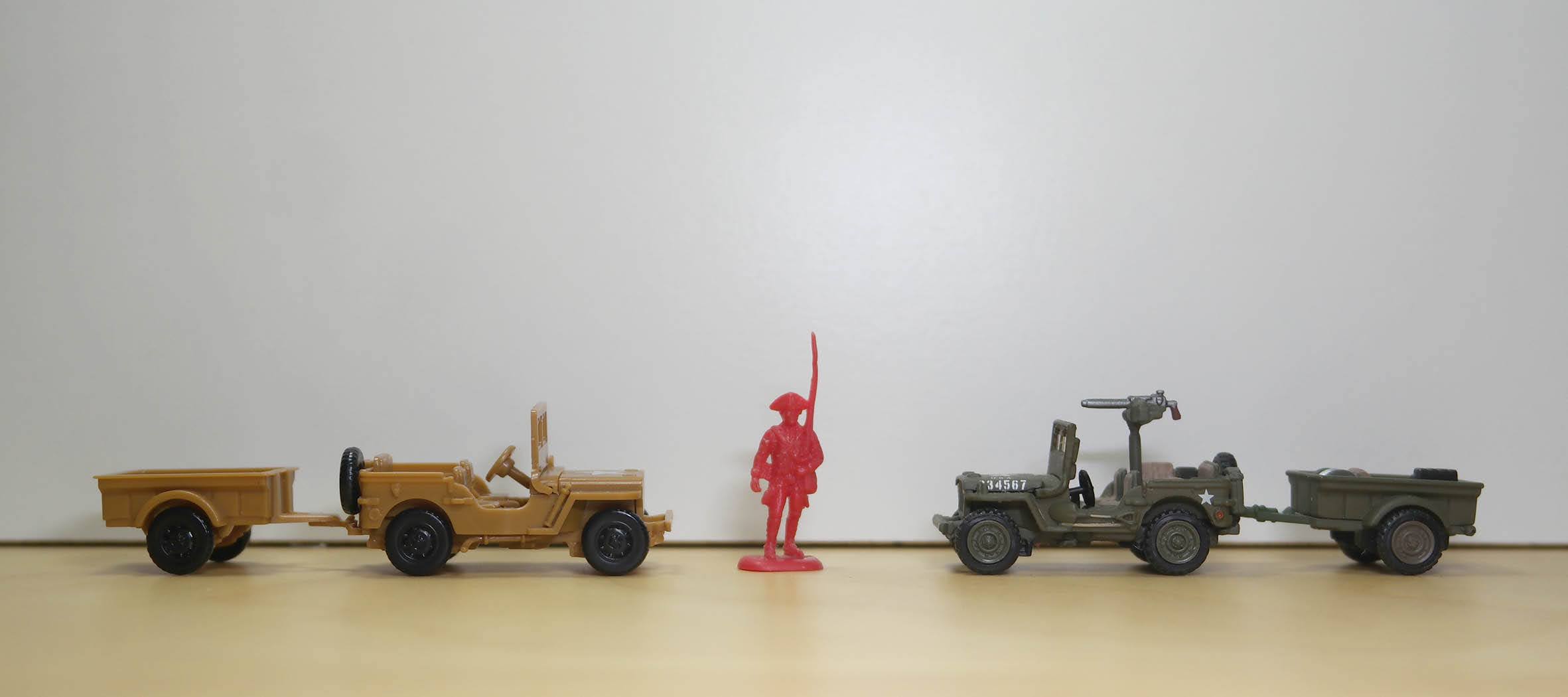 The jeep comes molded in dark green or tan plastic, and includes a cargo trailer. I bought one of each color.